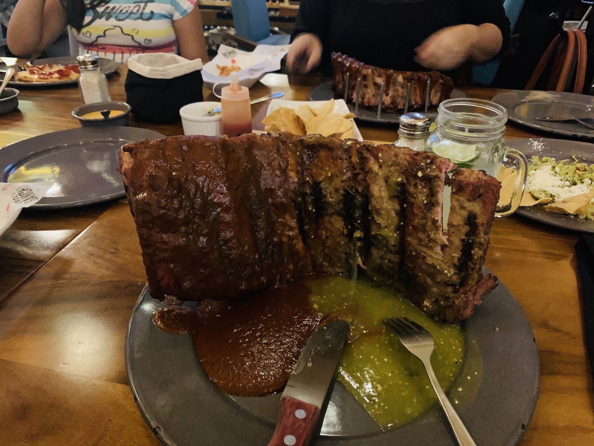 This was the first time I came here. My husband recommended it saying it was good. We came with his family, a total of six people. We each ordered different kind of ribs as well as fajitas and a pizza. Well let me start off by saying that the pizza was super small and not worth the price. The fajitas were super simple and came with a side of French fries. The ribs were pretty good. There are different sizes as well. But please note that the Chipotle sauce is really just Mole dulce. Honestly that was a disappointment. But everyone loved their food. The desserts were super small as well and left us all disillusioned. I had a Paloma and it was very delicious. For 6 people I ended up paying around $130USD. Not a bad bill considering ribs can...