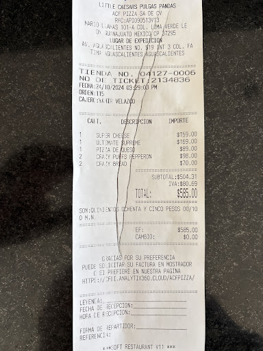 Read moreEs un Little Caesars como cualquier otro, pero lo que lo hace súper incómodo es la falta de autoridad y respeto a los comensales, permiten que una bola de entre 5 y 10 personas se pongan en la mesa dela entrada y estén con gritos e intimidación pidiendo a la gente que entra y sale dinero, es gente muy agresiva que no consume y no debería estar ahí, pero los encargados del local no ponen orden y eso hace la estancia ahí demasiado incómoda, les recomiendo no acudan solos y de preferencia que no consuman en el lugar porque es muy molesta...