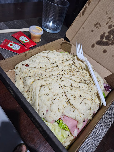 Hicimos un pedido en Uber Eats: una Focaccia y una Pizza. Lo que ven en la foto, se supone sea una Focaccia: no sé de dónde salió esta moda toda hidrocálida de llamar "focaccia" a una cosa de "ingredientes entre dos capas de masa de trigo", pero dudo fuertemente que encontrarán algo similar en la colonia Trastevere de Roma: pequeña (20 cm), deforme, impráctica (se desmoronaba con tan solo tocarla), logra destacar negativamente entre las afortunadamente pocas pizzerias de AGS que insisten en agregar la palabra "focaccia" en su menu sin siquiera hacer una búsqueda rápida en Google para saber qué apariencia debería de tener (ver segunda imagen)... La pizza ha sido igualmente pequeña (20 cm) y algo costosa; ambos productos llegaron fríos, pese a una distancia de 6km y el escaso tráfico nocturno (¿habrá que buscar repartidores más veloces?)