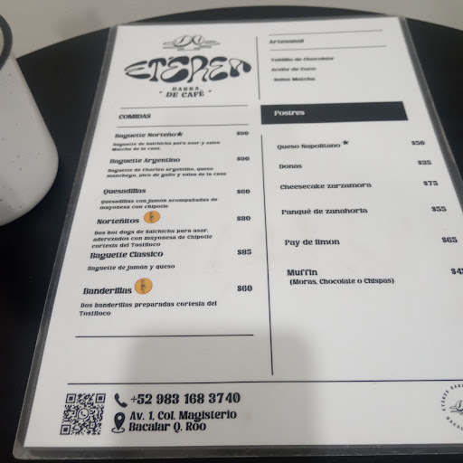 🍵 Hot Espresso & Tea-Based Drinks: • Mocha (12 oz) – $75 MXN • Caramel Macchiato – $65 MXN • Classic Cappuccino with caramel – $65 MXN • Té Chai / Dirty Chai (Green tea + exotic spices) – $70 MXN (M 16 oz: $75–$80 MXN) • Classic Cappuccino – S: $55 MXN | M: $65 MXN • Irish Cream or Vanilla Cappuccino – S: $60 MXN | M: $70 MXN • Americano – S: $50 MXN | M: $60 MXN • Artisan Hot Chocolate – S: $65 MXN | M: $75 MXN • Espresso / Espresso Cortado – $40 MXN