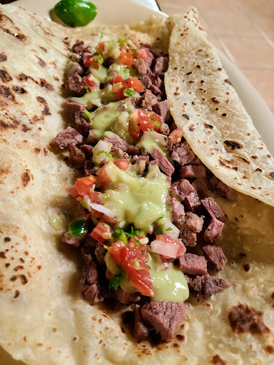 Read moreTucked away off the main streets, definitely worth the effort to find it! Fresh handmade tortillas (we had flour), high quality meat grilled over a mesquite fire, served with a condiment tray of tasty toppings (including pico de gallo, salsa, poblano creama sauce, cucumbers, lime wedges and marinated fresh slices of onion). I had the carne asada (steak) and arrachera (flank steak) tacos. Hubby had the asada burrito (very large). Served simply with the freshly made tortilla and very generous portions of meat to top as you please. Very reasonable prices, especially for the quality of the food. Highly...