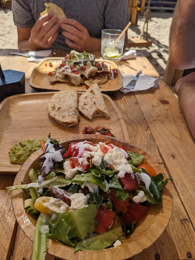 My experience here wasn't as positive as other reviewers. To be fair we came for a late lunch, not to hang out and enjoy all the beach activities and amenities they offer. BFBC has a great location right on the beach and as other's pictures show it's a cute vibe with music, levels, chairs, pillows, and cabanas. However the food was the worst we had on Cerritos Beach. Quesadillas were small, flaccid and although cheesy somehow flavorless. I got a watermelon salad that I thought would be mainly watermelon with some feta, mint. It was mainly Romain with a heavy dose of a thick blue cheese style dressing. The nachos were the worst. Dry, thick, flavorless chips with strange bland toppings. We were just disappointed. We had multiple dogs under our table, sitting on our feet that the staff kept talking to so I felt like they were always there but not a big fan. Maybe just a bad day but not a good...