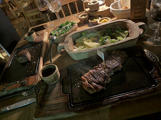 The waygu tartar and the oysters were the stand out dishes to us. The tartar was very flavorful and the oysters were fresh and came with a delicious sauce. The Caesar salad was salty and very basic with huge chunks of lettuce, we had a hard time eating the salad without cutting it. The shirt rib tacos were tender but flavor was lacking. The rosemary French fries were crispy on the outside and creamy on the inside but came out lukewarm. The oly thing that came out piping hot was the arachera steak because it was on a sizzling skillet, but sadly it was over cooked and over salted. The meat was tough and chewy, veryy difficut to cut with the oversized machete of a knife they gave us for our steak. Definitely not what I expected from "The Best Steakhouse in San...