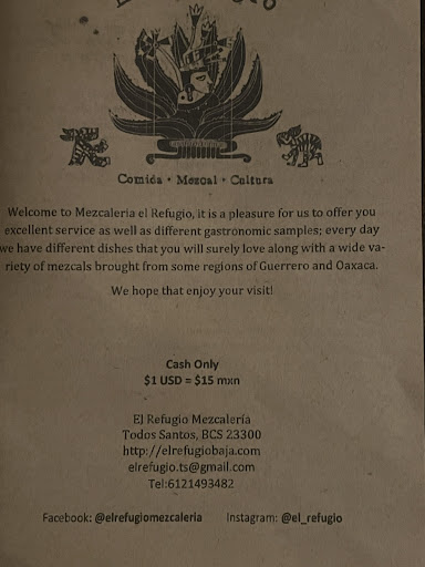 Read moreMy husband and I stay in a town 3 hours away for a week but we always make a special one-day trip each year to Todos Santos for two reasons--Playa de Palma (a beach) and El Refugio. El Refugio is consistently outstanding. I mean, it's our favorite restaurant outright. This family run place is not just another restaurant. The food is always top notch. Pork, chicken, fish, vegetarian dishes on a non-set menu. Everything is creative yet authentic for the Guerrero and Oaxaca region. We are never left wanting. Instead it just seems to get better. The owner Noel and his family are special people--warm and inviting in affect. The drink options are extensive. Mezcal is the focus and it's so fun but all drinks can be made with tequila too. And the mezcal selection is clearly carefully curated. This place is objectively the best, most interesting, most novel restaurant in Todos Santos. The food is consistently exquisite. It doesn't matter how fancy other places look. This place should be at the very top...