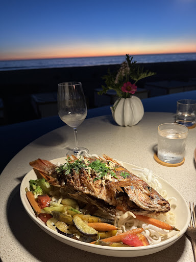 First off, the setting of this restaurant is as gorgeous as it gets. Situated beachfront on a long expanse of white sand and crashing waves, you’ll probably see whales cavorting in the distance. I suggest that you try and arrive before sunset for a real treat. The open air dining room is designed with reflection pools and mood lighting that shimmers like the inside of a seashell.