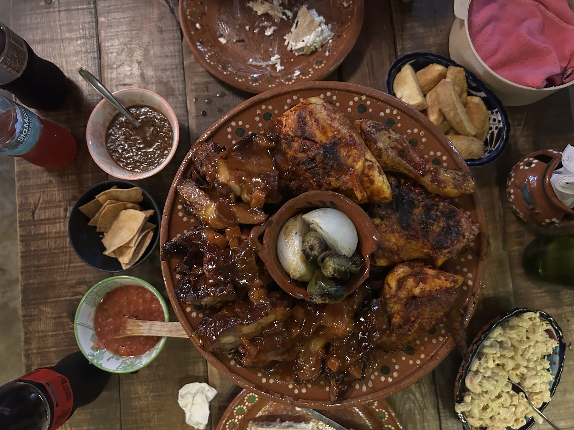 You get mac salad, fries, tortillas, salsas the works before your food arrives.