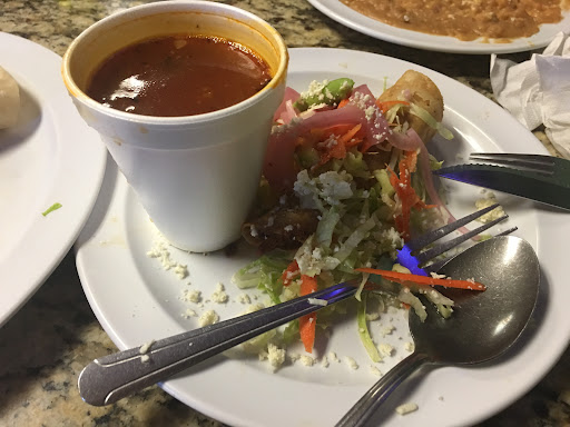 I forgot to take pictures but it was good. I ordered the 3 hard beef tacos loaded with veggies, lettuce, shredded carrots, sliced cucumbers, sliced raddish, pickled red onions, avocado, and spinkled cotija cheese. It came with a little cup of flavorful consome. It was pretty good. I added the crema and spicy salsa on the table. I also ordered the side of frijoles puercos, they were ok. I Thought they were like frijoles charros, but they are more creamy. Not the same, but enjoyed them also with the salsa and crema on the table and chips. I probably wouldn't order those again, it was a big side. My dad had the Bisteque Ranchero, it came with rice, frijoles puercos sprinkled with cotija cheese, potatoes and tortillas. It also cane with a small sopita de fideo. It was all pretty good. This is his wifes favorite place to eat, she always orders the plate of 3 sopes de Asientos, to be honest I didn't really pay attention to what her plate looked at, I was digging into my beans. But she loves them so they must be good. All in all, I'd come back, I'd like to try the pozole. Also in December they have Champurado...