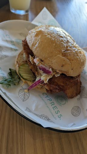 We were excited to try Cypress in the Plaza Peninsula mall today and seeing how busy it was we thought for sure it was going to be good. Upon walking up to the restaurant you notice how it is brightly lit and has windows on three of the four sides. We decided to split a sandwich and upgraded to the combo which includes an agua fresca and chips/fries. The counter service was friendly and she repeated the order back to us correctly before handing us a number to place on our table so the food could be delivered. We waited for a table to open up and eventually sat down. That being said, it took a really long time for someone to come and clean the table off. Then it took another twenty minutes before we finally received our meal. The chicken was the thinnest piece of meat I’ve ever seen on a chicken sandwich. Just ridiculous. And we had to ask twice for napkins that never actually arrived. The taste wasn’t awful but the chicken had a yellowish color inside that we wondered about. The fries were decent and the ketchup had a chipotle flavor which I wasn’t crazy about. All in all, we won’t be going back. It would have been one star if it wasn’t for the attractive atmosphere and the...