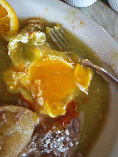 Terrible. I don't recommend it! I will not go there again. Teribile- mucho costoso..mucho lento..cibo muy malo!! Terrible service! I walk in and there was only 1 table. I ordered immediately eggs and ask for juce no sparkling. He suggested lemonade natural. Which was 50 pessos (normally cost 25 in Mexico) but I decided to try it. After 5 min the server come with a white drink in a cup asking me to try it. I checked the menu he was trying to sell me a drink that cost 80 pessos 😂😂😂even after I ordered. I said I am alergic to milk and coconut. So he took it and left but he was visibly upset. He brings me a lemonade in not very clean cup. Took 35 minutes to bring the eggs. There was man behind me who get 10 min later and got his food before me. In front two Mexican girls get their food and I was still waiting. I was thinking to walk out. When he finally get to me with half empty plate! I have ordered this dish in many other cities in Mexico-it comes with rice and beans and tortillas it is very rich breakfast. Uevos divirciados- normally cost 60to 80 pessos. Here cost 100 pessos! I told they would really bring a nice dish! After 40 minutes he brings me a big plate with 2 semi raw eggs on the side. There was 1 sopon of been pure in the middle with 2 chips creating a triangle on top-just to cover the empty plate. And an orange slices which seems they had in extra and just drop to cover the empty plate. The eggs were raw- so I asked him to please cook it! He took it back and come in 2 min and instead of cook it- he cover it with green salsa so I can't see it!!!😂😂😂😂😂 I opened and it was raw look the picture. They bring 3 tortillas on a side plate-the tortillas were old and dry!! Offaly served.. orally preparated.. Offaly slow.. and expensive for the areas..go 1 block down at the Mexican place-guarantee...