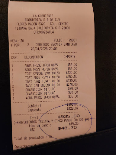Read moreThis place is fantastic! The go-to item is the red snapper tostada. A light and crispy tostada topped with thin medallions of snapper mildly "cooked" in citrus juice [lime?] ala ceviche, with some silvered red onion and thin avocado slices on top, and a small bead of chipotle sauce to finish. To die for! Look for the total count sold sign near the kitchen to get an idea of how popular this item is (over 300,000 as of this review). The other items are prepared exceptionally well--you can't go wrong with any of their plates. Those in the know will ask for the special peanut sauce (ask your wait person, you won't be disappointed). They recognize how in-demand their sauces are and try new ones occasionally (latest was a lime-based sauce). The setting, which hasn't changed much since this place was established in 1976, is like a giant beach palapa with the ceiling showing palm fronds which is a nod to the amazing fresh seafood available here. The bar is very good and well stocked with beverage and sipping-worthy tequilas and mezcals. The beer selection leaves a bit to be desired knowing that Tijuana has a popular and growing craft beer scene [hint, hint]. This point leaves me wanting a bit but the traditional Mexican lagers will suffice. Great for couples, families and groups. No visit to Tijuana is complete...