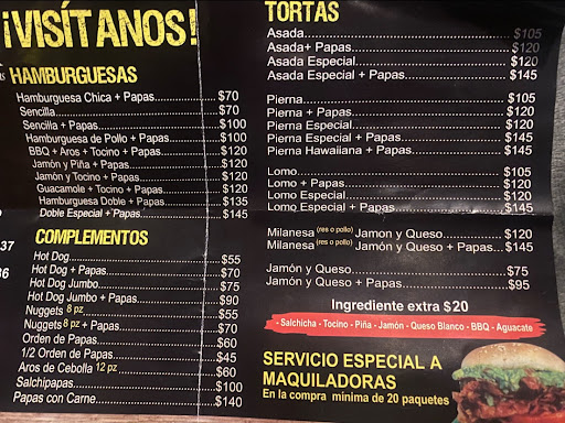 Full of flavor and love,we offer you the best burgers in Villa Fontana. This business has a crunchy consistency of its torta and huge ones with potatoes,in it menu they handle roast leg tortas,milanese,ham with cheese and loin.Enjoy them with your free fresh water.