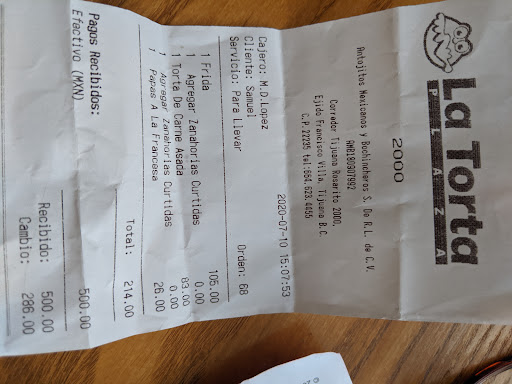 Read moreYO COMPRE UN TORTA DE CARNE ASADA Q ESTUBO EXELENTE. TAMBIEN PEDIMOS UNA ORDEN DE PAPAS ALA FRANSESA QHE ESTUBIERON RIQUISIMAS. CON TODO ESO YA DICHO EL UNICO PROBLEMA FUE LA SEGUNDA TORTA Q ORDENAMOS QUE SE LLAMA FRIDA. NO TENIA MUCHO SABOR Y MI PAN ESTABA REMOJADO EN LOS RESTOS DE LOS BEJETALES. MAS BIEN ERA UNA TORTA REMOJADA. TAMBIEN MI ORDEN DE PAPAS ALA FRANSESA ESTUBO MAL. YO RECUERDO ORDENAR UNA ORDEN DE PAPAS FRITAS, ME COBRARON 26 PESOS Y LA ORDEN ERA COMO DE 10 TROSITOS. YO NO CREO Q DEBERIAN COBRAR 26 PESOS POR UNA ORDEN TAN CHIKITA DE PAPAS. TALVES UNOS 6 PESOS. Y SIEMPRE PASA LO MISMO. TE PREGUNTAN Q SI KIERES QUESO O MAS QUESO O EXTRA QUESO PERO NUNCA TE DISEN Q HAY UN CARGO EXTRA. ESO NO ES UN BUEN SERVICIO AL CLIENTE CUANDO ESCONDEN SIERTOS CARGOS. SI YO PUDIERA DARLE UN 0 DE ESTRELLAS YO SE LO DARIA. TIENEN ALGUNAS BUENAS COSAS EN EL MENU PERO LA TORTA AH ARUINADO ESA EXPERIENCIA EN LAS 3 BUENAS COSAS QUE ME GUSTAN DEL MENU. ASI Q...