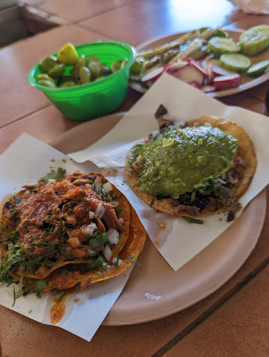 We enjoyed several birria and carne asada tacos around 11:30am and the taqueros were READY to go with the hot meats and the ladies were ready with all the taco accompaniments. Super sweet ladies working there. Make sure you keep close track of how many tacos you get since the system is relaxed (no POS) and a kind of honor system. They have mostly red meats: cabeza, suadero, adobada, etc. Vegans beware. Classic glass bottled sodas and horchata/Jamaica water available.