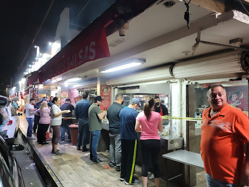 This is Taco alley, where the real wars are waged. White shirts, red aprons, big bellys and smiles, look for these things and donātā be persuaded by all the others trying to draw you away. They do all the accoutrements. Grilled green onions, radishes, peppers, plenty of limes and the famous 3 salsas. The traditional toppings are guacamole (not American style) and chopped white onions, cilantro and the original red salsa (chile de arbol). The verde is (tomatillo and jalapeno), the third is habanero are more optional. The corn tortillas are hand made and made to order, though they offering flour for quesadillas and other items, the tacos come with corn, donāt order flour like some Texan. Something you may want to try is the vampiro style where they griddle the tortilla on the plancha until its crunchy then fill with meats, cheese, top with guac and salsa. Think tostada, but concave and no beans, itās a little sloppier.