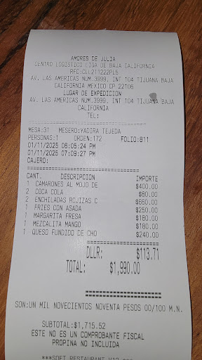 Read moreVisitamos el restaurante Los Amores de Julia alrededor de las 12:30 p.m., y desde nuestra llegada notamos cierta falta de organización en el servicio. El mesero que nos atendió parecía nuevo o con poca experiencia, ya que hubo varias confusiones con la orden. Como resultado, nuestras bebidas llegaron hasta la 1:10 p.m. Al solicitar el menú, únicamente nos ofrecieron la carta de brunch y desayunos. Preguntamos si había platillos fuertes y el mesero aseguró que ese era todo el menú disponible. Sin embargo, más tarde observamos que a otros comensales —que llegaron después— les sirvieron platillos de carne y salmón en menos de 30 minutos, lo que evidenció una falta de coordinación. Un empleado con camisa azul, al notar nuestra inconformidad, intervino de manera muy amable. Retiró al mesero inicial y trató de compensar la situación ofreciéndonos dos porciones de helado de cortesía, ya que el platillo de mi hijo llegó hasta la 1:57 p.m. Cuando finalmente recibimos la comida, los platillos estaban tibios y eran pequeños, por lo que no quedé satisfecha. Además, la cuenta por dos platillos y cuatro bebidas fue de $890 pesos, un precio elevado considerando la calidad y el servicio recibido. En conclusión, tuvimos una mala experiencia en esta visita. Aunque el caballero de camisa azul fue muy atento y mostró empatía, el servicio inicial fue deficiente y afectó negativamente nuestra experiencia. No estoy segura de que volvería, aunque agradezco la amabilidad del personal que intentó remediar la...