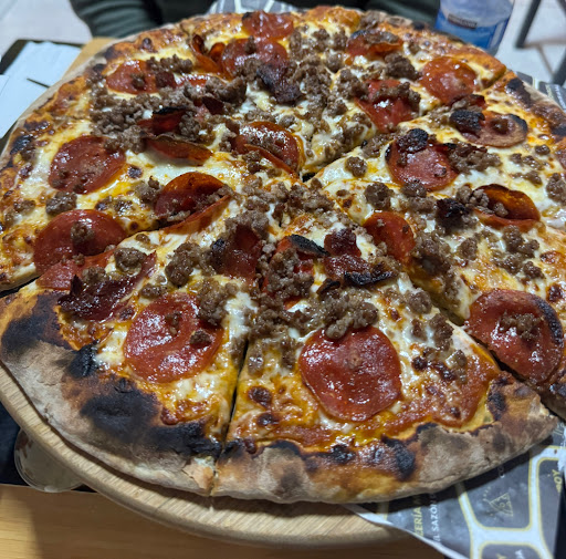 Se pidio una pizza grande que consta de ocho rebanadas estilo, especialidad Italiana (base de salsa de tomate, combinacion de quesos (no se especifica cuales), pepperoni, jamon y salchicha italiana): $200.00. En su pagina de IG se especifica que hacen las pizzas con masa madre, desconozco si sea masa madre por la nula experiencia en probar algo con ese tipo de masa. Se pidio con orilla de queso por $40.00 mas (en este caso es queso crema el relleno de la orilla); no esta mal, pero preferiria otro tipo de queso, pero por el precio me parece bien.