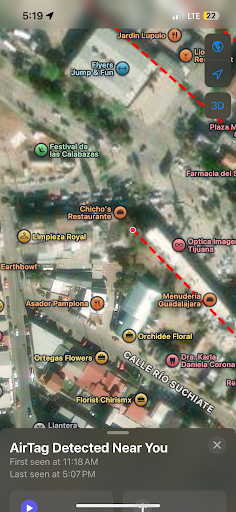 The food and service were good—no complaints there. Afterward, we ran several errands all over Tijuana throughout the day. Our final stop for the day was a coffee shop, where my daughter received a notification that an AirTag was tracking her. We searched the car and found an AirTag hidden in the trunk.