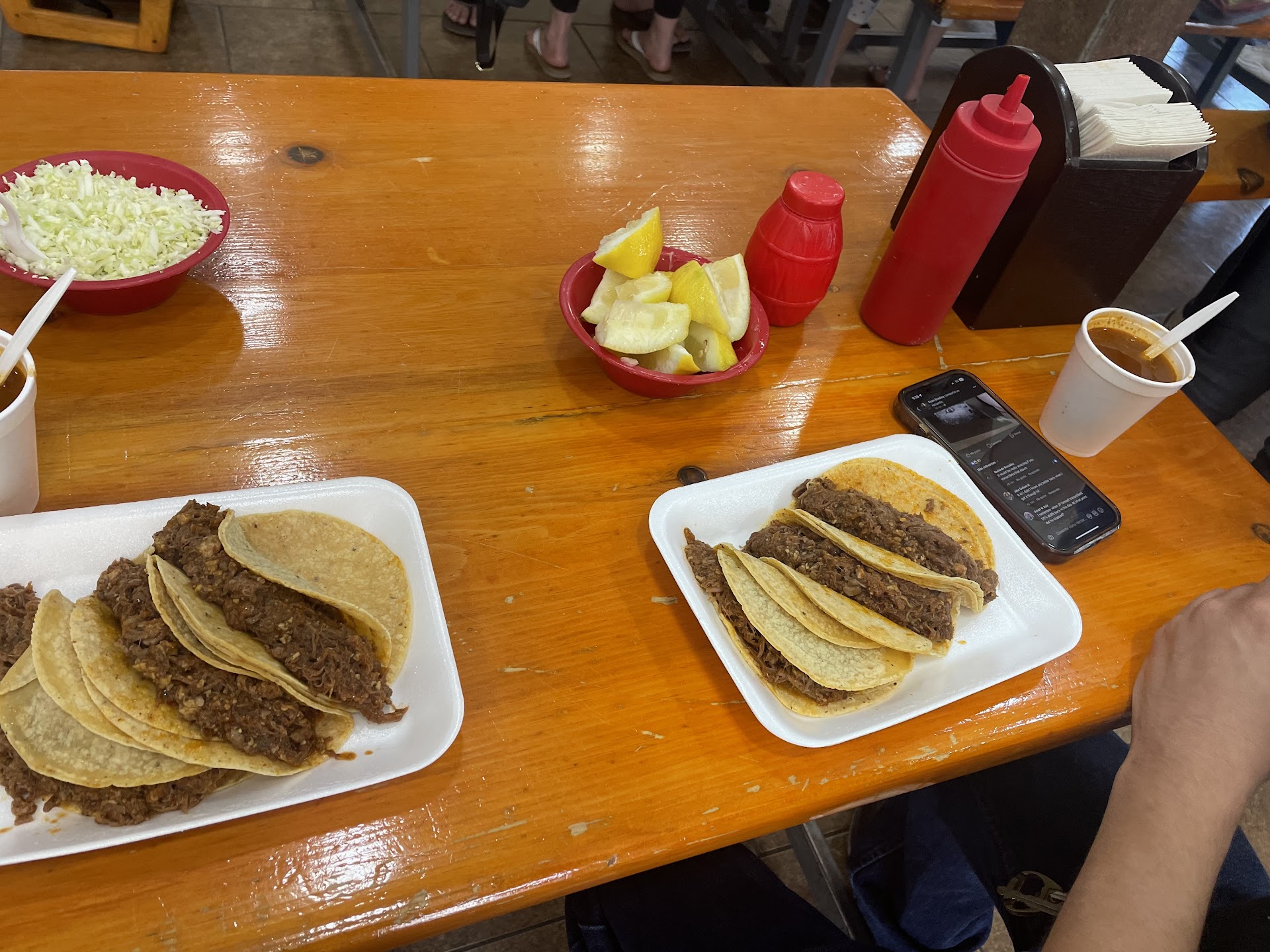 Además te quieren cobrar por verdura extra, si el servicio es para 1 mesa de 4 personas, la cantidad de verdura que hay no te alcanza para que cada uno le ponga a sus 3 tacos ( suponiendo que se coman 3 cada uno) La verdura es solo repollo y cebolla con cilantro.
