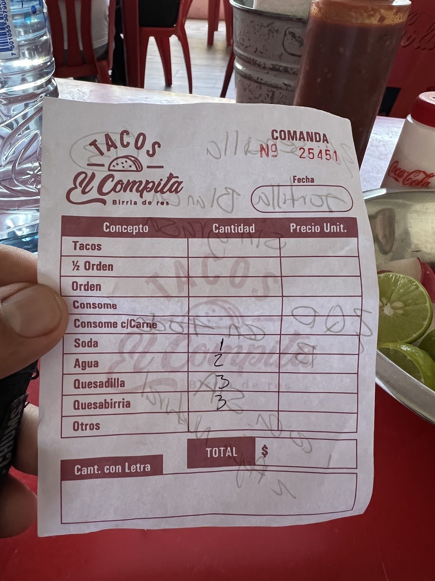Read moreAl llegar al rtnte. Me atendió un muchacho pedí 4 tacos 2 y 2 todo bien hasta el momento de pagar Ojo: en el ticket venía solo lo consumido pero no el total ni los precios, fui a pagar en caja, un total de 689 pesos pague me dio cambio al sentarme de nuevo me quede con la duda si estaba bien arriba de caja están los precios hice yo mi propia cuenta y me salia 345 pesos la hice más de 3 veces hasta que me pare a reclamar me devolvió el dinero diciéndome q se había equivocado con un gesto de desagrado me fui con un disgusto y volver ahí en mi vida obviamente jamas. Dejo a su coherencia si creen q se equivoco o era plan con maña. Por cierto ni están tan ricos los tacos muy simples, les recomiendo la birria del guero esta atra de la chevrolet de vía rápida atrás de mundo divertido a esa 10/10 nada q ver con...