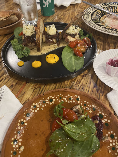 This is a restaurant for the adventurous. If you like to try new combination of ingredients, then its for you. Our order tonight consisted of two appetizers: beet salad and porcini mushrooms. The dressing was tangy and sweet, but the cheese really balanced it out. It had cherry tomatoes and a bed of greens. The mushrooms were placed on a some smooth sauce, and they were stuffed with cheese. It had bread on the side and cherry tomatoes again. Our entrees were bbq ribs, tuna birria, tuna chowder and mix of tacos. Ribs were a little dry but had great taste. The sauce lacked some flavor but the coleslaw and mashed potatoes were good. One of the tacos was called the Chicano, and that octopus was incredible. Not chewy or tough. The tuna birria—just order them. So good. We ordered crepes and a side of ice cream scoops ( 3 small scoop)—ginger, mamey with goat cheese and strawberry. Crepes were not sweet—they were perfect. If you like fruitful dessert with some nice, sweet after-taste, they are for you.