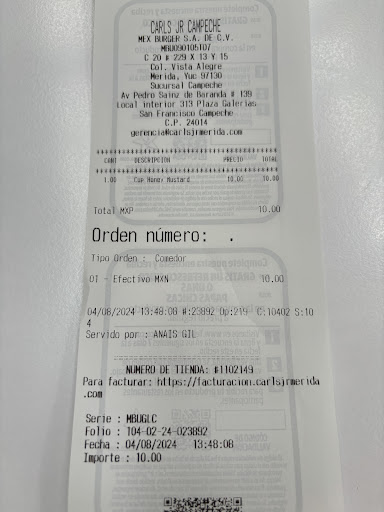 Read moreLlegué 5min antes de la hr de cierre pero me dijeron q sí me podían atender. Tardaron; le dieron mi paquete a otras personas y luego se los quitaron (cuando ya habían abierto la caja y se habían comido las papas) para devolvermelo "xq no habían tocado la hamburguesa". Tuve q llamar a la gerente xq la muchacha q me atendió dijo q estaba muy cansada y no volvería a cocinar otra hamburguesa. La gte se portó muy amable y volvió a encender el horno para hacer otra hamburguesa Memphis (la nueva), pero sinceramente tenía muy poco producto a comparación de la misma q comí en Carls Jr suc Paseo de Montejo en Mérida. Agradezco a la gte la atención pero ya ni disfrute mi hamburguesa...