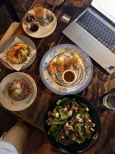 I ordered 2 entrees: a salad and the vegetarian spring rolls (with goat cheese, oh my god, so good!), alongside a fresh juice. Main dish was a Taco with camarones empanizados (my favourite) and a tostada with sashimi de atun. Taste explosion!
