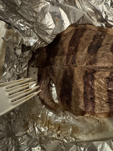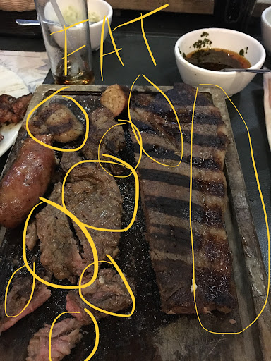 De pronto pasó nuestro mesero y le preguntamos si faltaría mucho, por lo que nos comentó que iba a checar con la parrilla y de pronto llegó con nuestro corte y la papa al horno. Es raro, pero desde que se aproximó a la mesa, sentí un aroma extraño, algo que no olía bien... pensé que tal vez era idea mía, y como me moría de hambre, corté un trozo y lo probé. Ese mismo aroma extraño se sentía al probarlo, pero no supe qué hacer. De pronto mi novia me dijo: "Este corte huele mal... lo probé y no sabe bien." Entonces llamamos a nuestro mesero, él tomó los platos para llevarlos a la parilla y de pronto regresó para decirnos que de acuerdo al chef, no tenía nada mal, y nos preguntó si nos ofrecía otro corte diferente, pero no quisimos arriesgarnos, así que mejor nos terminamos la papa y pedimos la cuenta.