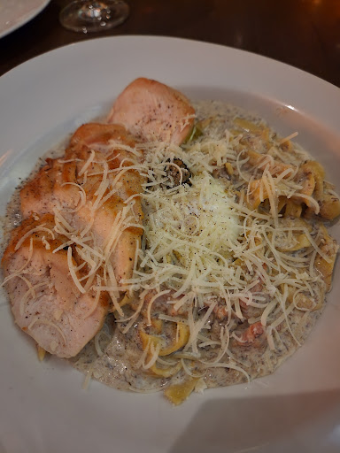Open the menu to find a nice selection of antipasti, soups, salads, pizza, risotto, fresh house-made pasta, seafood, beef, and pork. A long wine list accompanies, so ask the server for a recommendation based on what food you will be choosing to eat. We were first given a small set of salami and cheese to try, followed by an assortment of different bread rolls and olive oil. After going through the menu, there were too many items we wanted to try, so we first selected the Pizza Nera al Carbone (Black dough pizza, tomato sauce, buffalo mozzarella, green asparagus, pancetta, and roasted cherry tomatoes) and Insalata di Rucula, Proscuitto e Ficchi (Arugula salad, crunchy prosciutto di parma, black figs, fresh cherry tomatoes, strawberry-balsamic gel, and grapefruit vinaigrette). The salad was great – crisp arugula, crunchy prosciutto, and flavorful dressing. The pizza was equally as good – firm crust, rich cheese, and nicely portioned toppings. We were given a small palate cleanser (light sherbert) and then we proceeded to the entrees. For our main courses, we had Fettucine Carbonara al Tartufo (Traditional Roman style carbonara, pancetta, black truffle, and egg) and Garganelli al Ragu (Sweet Italian sausage, ground beef and pork ragout, ricotta cheese, and romanesco). The fettucine carbonara was fantastic – fresh pasta, rich sauce, and a runny egg. The ragout was equally as good – nice blend of meats, flavorful cheese, and nicely portioned. For dessert, we had a small scoop of gelati with a berry sauce. From the presentation to the quality and taste of the food, everything was excellent. I would recommend selecting a bunch of different items including the fresh, house-made pasta. We were offered a rose at the end of our meal. It made for a great date night meal and experience. I would not recommend bringing kids here. There is also an elevator for those needing...