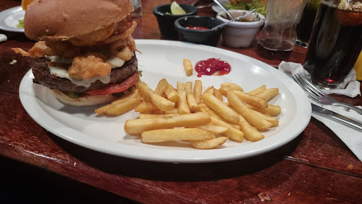 Probably fake steak in the burger ( those disgusting frozen ones , the french fries as well), the guacamole was at best average . My mom had tacos and the shrimps felt the same . The service was great and the ambiance was good.