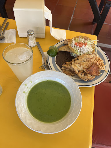 Read moreMuy buena la comida, y las aguas frescas. Muy recomendado. Lo único es que no tienen ningún tipo de postres, solo una ensalada dulces con zanahoria col y pasas. Nos faltó comernos terminando un Panchito dulce aunque fuera, o un buding, aunque hubiese sido algo sencillo es lo que extrañamos con la comida tan buena que ofrecen. El postre lo comimos en otro lado. Por lo demás, todo muy rico. Tengan en cuenta que les dan al llegar un plato Ondo y un plato plano, y los usan sin cambiarte los por otros limpios, así que ves comiendo lo seco que no tenga salsita al principio y lo de salsa después para que no se te mojen en la salsa las tostadas o alguna comida que no quieras que se manche con los restos de comida que comiste al comienzo. No me molestó eso, pues cuando uno come en casa no anda comiendo cada platillo en un plato diferente. El precio es muy asequible aquí, y es bueno que seas consciente de lo que comes y también de las personas que trabajan ahí para darte una rica comida por muy poco precio. La crema de brócoli riquísima, ya me llene tanto con otras cosas que no pude probar el caldo de res, pero tenía muy buen aspecto se veía rico. Otro día que vaya probaré el caldo de res si lo tengan disponible. No sé si cada día son los mismos platillos o cambien y haya diferentes. Cuando tenga que volver a Cancún por algo ya se dónde...