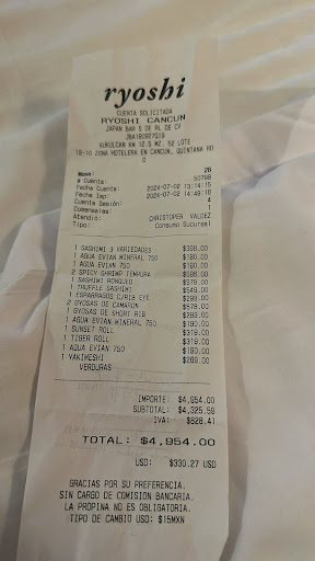 I’m genuinely very excited to write this review! Two words: Cannot miss. Having tried multiple restaurants here in Cancun, this by far is the best one I’ve had and quite honestly, some of the best sushi I’ve ever had. First, when you walk in, you’re greeted with a stunning, waterfront, open air restaurant on the lagoon of Cancun. It is fun, elegant and perfectly pieced together. The staff went above and beyond for not just my table, but each table in my sight. Drinks were brought promptly, plates were removed immediately to make room and there was a great balance of checking in on us. I only tried one cocktail: the Ameterasu I believe but it was fantastic, well balanced, and great portion. We ordered the spicy edamames which were more flavorful than I’m accustomed to for edamame (usually just salt) but I was certainly wanting more. Next I received an A5 Wagyu skewer which was incredibly tender and flavorful. I was hesitant as the fat was present but relieved how it melted with the bite. Then came the main course: my wife and I split the Ryoshi roll, Tartufo Roll, and the Spider roll. All three were amazing but given that this restaurant receives fresh whole tuna Tuesdays and Saturdays and will prepare the cuts in front of the restaurant, I would say a roll with Tuna is mandatory so for this reason the Ryoshi or Tartufo were my favorites as well as just how perfectly prepared the Tuna was - lightly seared on one side. To end the night, we ordered the Banana Pie which had a serving size twice what I expected, balanced across each bite and a perfect way to end the meal. Now for the fun part, apparently multiple times through the week, they will have fire and acrobatic shows. Tonight, we were amazed by an unexpected fire show with two young ladies and one man twirling fire in their hands, up and down their spine and breathing fire out their mouth. It was an unexpected treat that continued to elevate this restaurant. So far, this is one not to miss. 10/10 and well done to Chef and the...