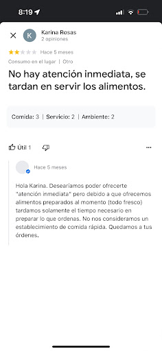 Read moreRespondiendo al comentario de "comida rápida" aquí mi respuesta: entiendo esta parte de no ser un establecimiento de comida rápida, pero para preparar dos bebidas (frappes) te demoraste 45 min después te haber tomado la orden, en cuanto se te volvió a recordar depues de 45 minutos, tardeste 2 minutos más, y cabe mencionar que solo había 2 familias con 5 integrantes promedio. Considero que por lo menos el tiempo de las bebidas no debe ser más de 20 min (obviamente dependiendo la preparación). Por su atención a este comentario muchas gracias, espero tomen las...