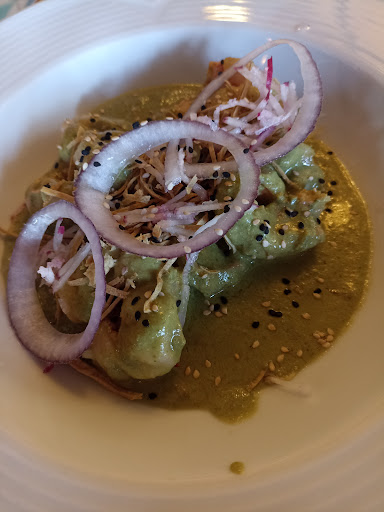En cuanto a los camarones al mole verde, son una propuesta interesante, visualmente atractiva sin embargo el error en los platillos con camarón en general en el lugar es que el camarón tiene la apariencia de ya estar precocido y solo se le agrega la salsa o estilo de preparación lo que hace que los camarones sean insipidos.