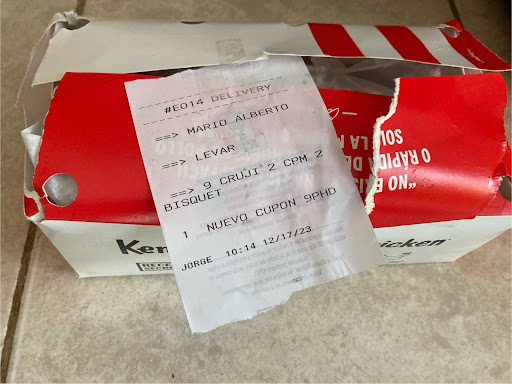Los empleados son muy distraĂdos y se la pasan platicando. Creo que le dieron mi cubeta al de Didi con la etiqueta de Ă©l y a mĂ me dieron la caja de pollo del de Didi con el ticket de mi pedido. Cuando me iba alcancĂ© a escuchar que una empleada le decĂa a otro: âAyer te equivocaste y diste tantas piezas en lugar de tantas otrasâ. O sea, que eso les pasa con frecuencia.