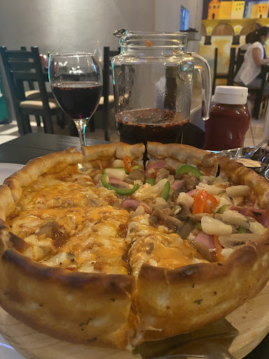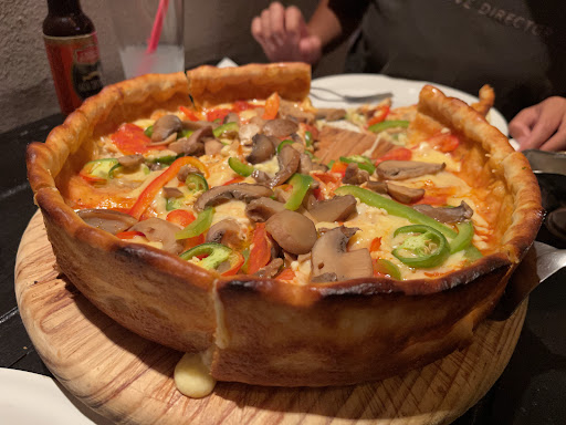 Tuve una mala experiencia sin embargo intentaré ser objetivo y no guiarme solo por la molestia, la ubicación considero que es acertada ya que se encuentra en una esquina, no se me dificultó encontrar un lugar para estacionarme, el ambiente es agradable, con respecto al servicio les cuento que llegué a las 8:00pm aproximadamente, demoraron un poco en tomarme la cuenta ya que estaba lleno y solo habían como dos meseros, pedí la pizza estilo Chicago la cuál dice que tarda entre 30 a 45 min aproximadamente, el problema fue que espere más de una hora por lo cual pregunté si tardaría más mi pedido pero me dijeron que hubo un error por lo cual tardaría más de 25 minutos para esto ya eran las 9:15pm, según en otros comentarios cierran a las 10-10:30, pagamos las bebidas y nos retiramos comentando que la pizza ya no podíamos esperar más tiempo estamos de acuerdo que no la comería a la carrera, el sabor de la comida no puedo calificarla pero si el servicio el cuál considero que ni una disculpa pudieron darnos por lo menos el gerente acercarse y decirnos que lo sentían, entiendo un error cualquiera lo comete pero en nombre del local si deben hacerce responsables de su error. Si vas solo, con tu pareja o con amigos, no llevas prisa y tienes el tiempo de esperar pues igual y podrías probar aunque considero que hay mejores opciones aunque podrías darle el beneficio de la duda, si vas en familia con niños no te lo recomiendo por el largo...