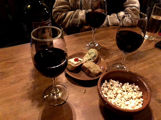 There’s an extensive wine menu from across the world. The local wine starts at around 30pesos per glass. They have filtered water available by the glass upon request. Part of the charm of the bar is you get a tapas item with each glass of wine. Ours we had a small slice of baguette with cheese. They also provided unlimited popcorn for the table. The staff are very friendly and helpful with suggestions on what to order. There’s a patio in the front which is perfect for people watching on the busy street. There’s also a small back patio for smoking.