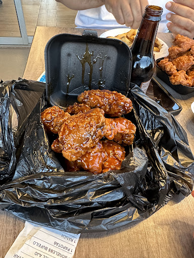 Read moreBonito local, sólo hay 4 mesas para poder comer ahí, la principal primicia es que te lleves la comida a tu casa. Las alitas tienen un empanizado estilo kfc pero sin el mismo sabor, las personas que me atendieron super groseros, se les veía que no tenían ganas de estar trabajando, excepto por un chavillo que estaba limpiando. Las orden de papas fritas que pedimos estaban super remojadas en aceite, cosa que no deberia de ser asi, no las recomiendo Lo más rescatable son los boneless, es una muy generosa porción de pollo empanizado frito. NI SE LES OCURRA ENTRAR AL BAÑO, ES UN INFIERNO CANDENTE,...