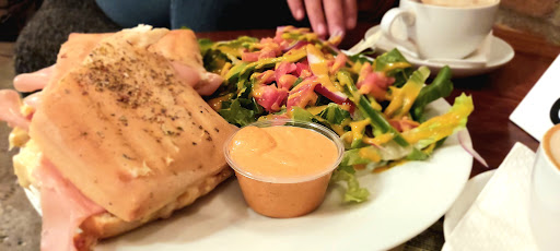 Pedimos un panini de pavo con ensalda y dos capuchinos chicos. El capuchino chico es realmente una taza chica, pero punto exacto de cremosidad, un cafe con un saber excelente. La ensalada estaba totalmente crocante, todos los vegetales frescos y perfectamente aderezada. El panini, sin llegar a ser espectacular, era muy bueno, aderezado con una mayonesa de chipotle. Las porciones sumamente generosas nos alcanzaron para comer dos personas que buscan...