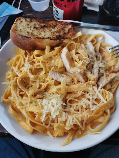 My first visit here while on a layover w/ my fellow crew members. Friendly staff and cool looking comic hero themed place. After being seated, I decided to order a frozen mango margarita (note it was sour it didn't taste like mango in my personal opinion) and a water. The water is served by individual bottles. For our appetizer, we ordered the mozzarella cheese sticks. They were very tasty. Only wish the marinara sauce served w/ it was served in a larger container. After looking over the qr code menu link, I decided along w/ our waiter's assistance to order the pesto chicken pasta. It was delicious. However, if you decide to order this, I would pair it w/ some bbq pizza to share w/ your fellow guests. You can...