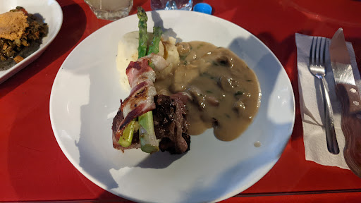 My wife had the Steak: and this steak was bringing tears to my eyes: 10/10 flavor, 10/10 tenderness, and it was served Very hot, but cooked rare, which is a very hard thing to do.