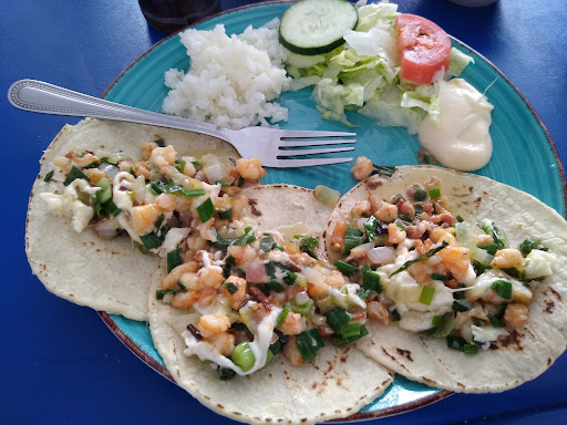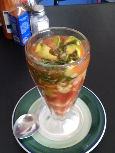 As we entered the establishment, (thinking it was a "tiendita" (small store) we were immediately welcomed in and quickly offered us a seat. Not wanting to disappoint the small business, we decided to accept the invite, and have lunch here. The restaurant is really really small, but the hospitality, service and food are all with big hearts. I ordered the Mojo de Ajo (breaded garlic fish fillet) and Willie ordered the Veracruz (sauteed fish with lots of different veggies) a medium shrimp cocktail, with all the fixings, and two drinks. Our meals come with 2 small bowls of delicious fish soup, (as appetizers) and a bowl of freshly made tostadas with salsa. Our entree plates, were healthy servings, but most importantly "sabrosos" (delicious) with the best customer, and the cherry on top, 30 bucks (including tip) for the entire meals.