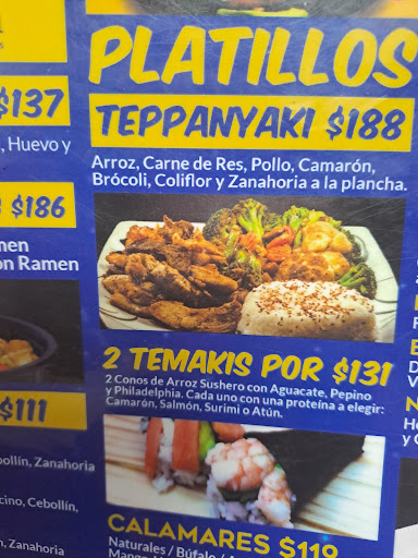 Read moreEl precio está igual que en todos lados que si vas y comes a cualquier restaurante , El sushi está seco y sin sabor , la presentación ni se diga en las fotos se ve muy bien pero en persona nada que ver , por lo que me di cuenta le dan prioridad a la gente que come en el restaurante , hize una pedido para llevar y me percaté que las presentaciones eran otras de la gente que estaba comiendo ahí porque cuando abrí mi pedido nada que ver , la verdad no regresaré al lugar por $400 pesos en 3 rollos mejor voy y como a un lugar más rico , el precio es igual que en todos lados como mencioné pero igual y no malgastaría mi dinero cuando el sushi no está rico le doy un 4/10 , insípido y el relleno de adentro trae bien poquita cantidad ah y por último el camarón tenía un sabor súper raro , al igual que el pulpo no...