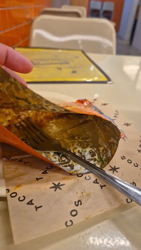 Ordené tacos de trompo de asada con chicharrón: el sabor es aceptable, un 7/10, pero podrían alcanzar un 9 si el chicharrón no fueran migajas del fondo de la bolsa. Las porciones son francamente pequeñas en relación al precio. Ejemplo: una bolsa de papitas con frijoles charros cuesta $139, el agua de maracuyá $129, y los tacos $139. Terminas gastando entre $400 y $500 y te quedas con hambre.