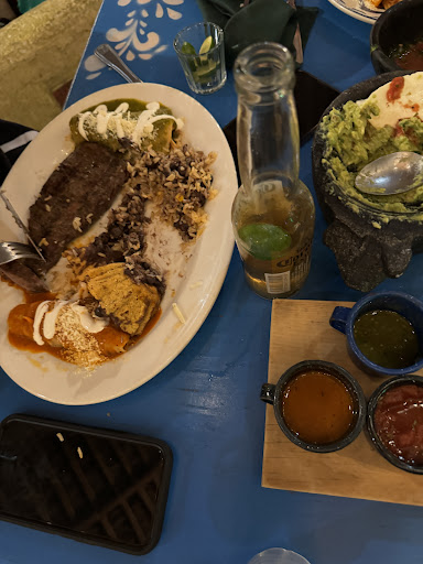 I wanted to like this place. After eating at local casual spots we wanted to try somewhere a little more “upscale?” Immediately noticed our table was wobbly. Not just a little, like dangerous to eat on. Upon request the waitstaff fixed it. Not mad about it. But charging those prices tables shouldn’t be like that. Margaritas were good but $16 dollars. The setting is fine for what it is. Mariachis and ballon man. Service was friendly and good. The food was im sorry to say embarrassing. Slop and drop for sure. $34 dollars for unseasoned beef and peppers in a hot mortar. Oh there was cheese too but it was in large chunks and wasn’t melted or even edible. Was that a small leek or giant green onion on top? I couldn’t cut it with the knife. No plate either just a hot mortar. Tortilla were meh (flour?) Reminded me of bad Mexican food in Alaska. And my girlfriends Chile relleno. Yikes. Veggies or cheese? Nope just cheese. Also, What was that mashed potato enchilada? And in a pool of spaghetti sauce? Beans out of a can? Rice would be called bland by my Midwest relatives. No love in the food and no culinary anything. If I’m paying $34 dollars for a dish it better be plated not just lazily thrown in a mortar. One of the most unsatisfying meals of my life. If it was 30% cheaper and you just wanted a tourist “Mexican” experience yeah sure whatever go out with the friends and family and get sung to and enjoy the atmosphere. People were friendly but I felt embarrassed for...