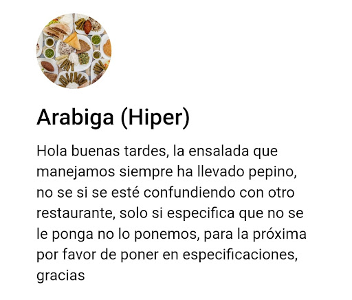 Read moreEstoy super decepcionada, solia comprar mucho aqui y el trato no es el que uno espera, solo comenté que debían especificar que su ensalada lleva pepino, porque soy muuuuy alérgica y ya habia comprado antes y no le habían puesto sin que yo les comentara... me da tristeza porque la verdad si me gusta su comida, ya no volverè a comprar con ustedes, dejo el comentario que me hicieron y la evidencia de que solia comprar mucho...