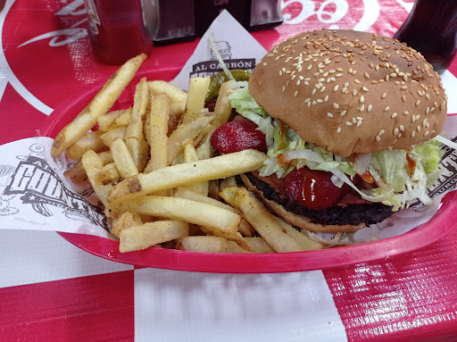 Read moreHamburguesas al carbón, grandes y bastante llenadoras. Todas incluyen una orden de papas, las cuales están muy ricas y recién hechas, buena porción. Todas las hamburguesas son hechas al momento y los precios varían, dependiendo de la cantidad de ingredientes y de carnes (de 1 hasta 3). No tardan mucho en servirte y la atención es buena. Bebidas en $30. También cuentan con hot dogs y boneless. Puedes comer en el establecimiento (ambientado con temática de country/viejo oeste) o pedir para llevar desde tu auto, hay amplio estacionamiento. Excelente opción si traes mucha hambre, mejor que...