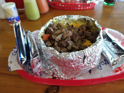 En el lugar se pueden pedir tacos, aunque mi recomendación es que pidan algún platillo con papas al horno.
