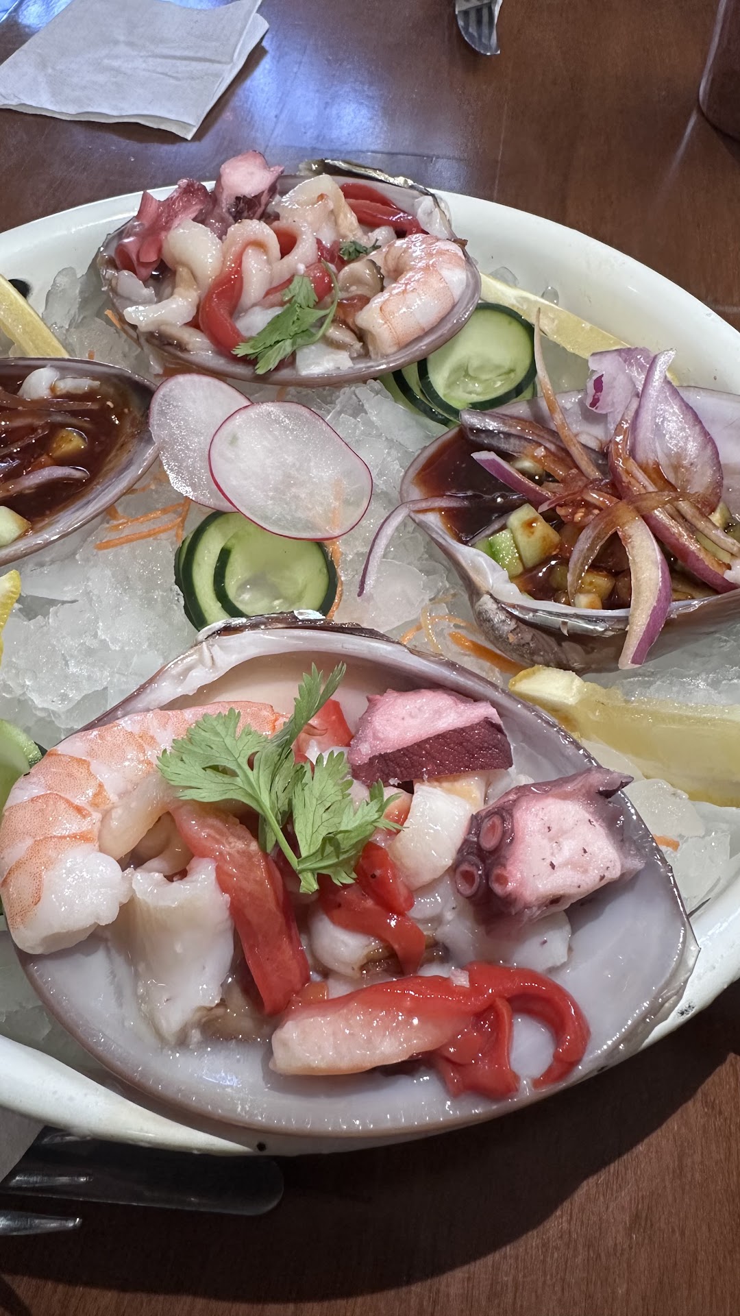 Read moreFui con muy buenas expectativas. Primeramente fue un problema en contra estacionamiento porque todos estaban muy lleno aún teniendo dos lugares para ello todo estaba full. Nos se atendió una chica amable que nos llevo hasta la mesa. En poco tiempo llegó un mesero. No se le veían muchos ánimos de estar ahí. Apenas nos dio la carta y nos pidió que le dijeranos las bebidas. Al ordenar las bebidas no parecía que pusiera atención ya que se le tuvo que repetir en tres ocasiones cómo es que se querían. Aún así cuando la trajo la trajo mal. Al momento de ordenar los alimentos nos informo que lo que yo pedí no estaba disponible. No había almejas... Bueno... Las cambié por ostiones. Los ostiones estaban mal abiertos no estaban separados de la concha y tenian pequeños pedazos de concha que al comerlo es bastante desagradable corderlas en la boca y peligroso para los dientes. La "vinagreta" cómo podrán observar era pura agua de cebolla morada con vinagre horrible incomible En fin... Una decepción los ostiones. La tostada de callo de hacha estaba bastante decente al igual que la de la casa. Nada espectacular. Los demás platillos también estaban aceptables . El lugar no es malo pero deja mucho que desear el servicio y el poco amor que se le pone a los platillos, no solo es presentación. Lo más importante es el sazón y que cuiden los detalles. Pero lo más desagradable es que un mesero te exija la propina. Y no porque no se deba sino porque la mesa todo el tiempo estuvo sucia no se acercó para preguntar si todo estaba bien u ofrecer más bebidas. Pero si al momento de pedir la cuenta saber cuánto le ibas a dejar de propina eso sí era importante. Fue más atento el garrotero que nos llevó la comida. Ojo con esas cosas. Muchas gracias...