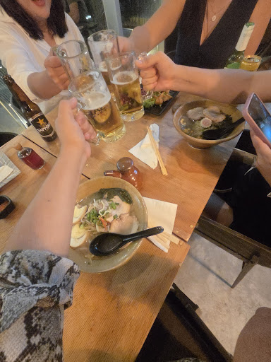 Read moreTenía tiempo queriendo ir, y tuve la oportunidad de ir con amigas. El lugar y ambiente es muy agradable, perfecto para dates , o salir en grupo o hasta ir solo (a). En cuestión de comida no me encantó, estaba rico, pero los noodles del ramen no eran wow, he ido a otros lugares donde el sabor es único y preparan sus propios noodles, les hace falta algunas cosas típicas de la comida japonesa (udon, yakisoba, que podrían incluir, uno espera eso), pero en si lo que ofrece esta bien, pero para el precio y lugar esperaba más, lo que si me desepciono es que pedi 2 entradas y no tenian ninguna, las otras opciones no eran para mi ya que tenian camarón y soy alérgica en fin (gyozas y charsiumaki =rollos primavera), una amiga pidió takoyaki (bolitas rellenas de pulpo, no fue nada del otro mundo y casi no tenía pulpo); pedí un tonkotsu Ramen, y estaba bien 8/10. En bebidas cuentan con amplia gama de cervezas, drinks y aguas de sabores, eso si 10/10. Pedimos diferentes cervezas.