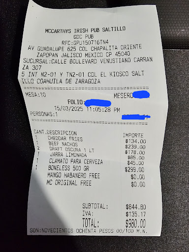 Siéndoles honesto, yo fan del mccarthy's desde hace años, actualmente mccarthy's saltillo ya esta en decadencia y no vale la pena ir, actualmente hay solo 2 meseros (la atención es buena de ellos) para todo el lugar y no se dan abastos (anexo mi ticket para 2 personas), pedí una orden de boneless y llegaron tibios/fríos, estaban duros, ya nos los ampanisan ni nada, igual la orden de papas con queso, literalmente agarraron un puño y las pusieron a freír y pareciera la q la ración de queso solo era un "shot" y aparte frío, le pedí a la chava que bajaran las cortinas porque empezó a hacer viento frío y dijo que no, porque no se daban abasto ella y su compañero por las mesas. De las bebidas ps Xs, no puedes fallar en un tarro de cerveza. Así que YA NO recomiendo ir hasta que @McCarthysSaltillo mejore, porque ya no hay silla ni mesa qué no se pande, literalmente en mi silla tuve q tener un pie en el piso para sentirme seguro. Lo siento pero preferiré ir a Dublin en el centro u otro bar de Rock hasta que...